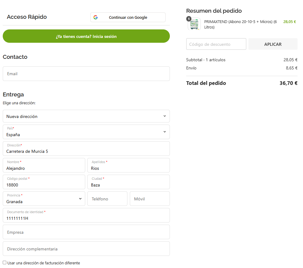 Estructura limpia: datos del cliente, direcciones, envío, pago y resumen del pedido en un mismo flujo.