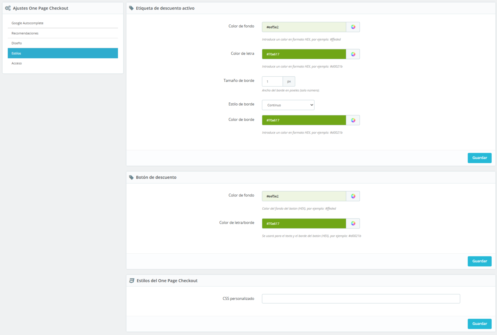 Configuración de colores y estilo de insignias (badges) y área de descuentos.